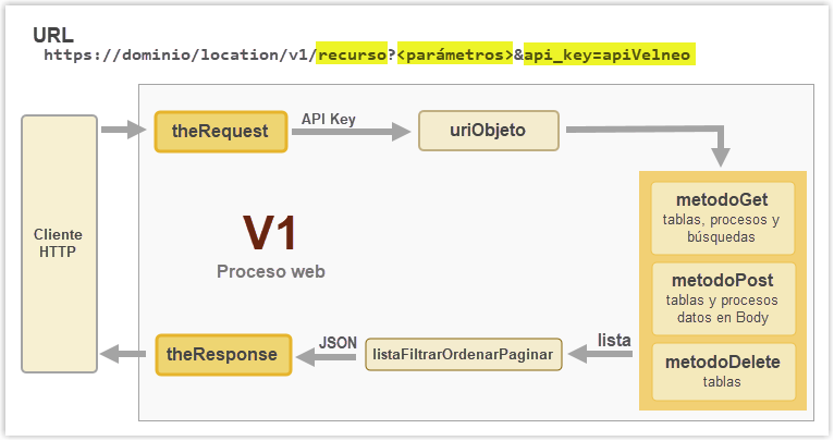 El módulo principal del API Rest de Velneo se ha programado en un solo proceso web llamado V1. El proceso V1 usa los procesos javascript v1.js y api_rest_funciones_v1.js.
