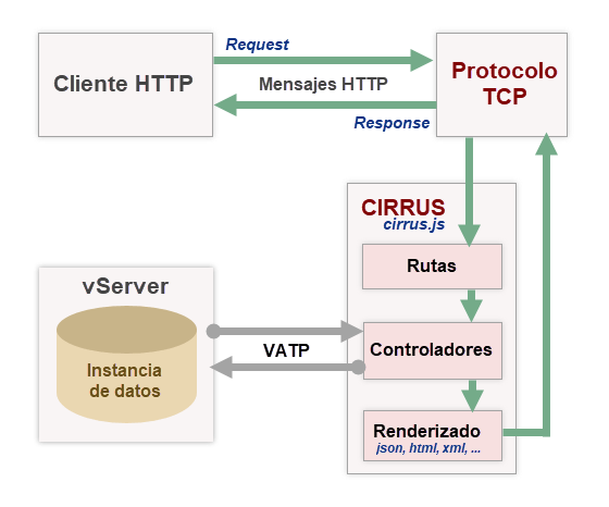 Una vez analizado el Request, el proceso web enviará los comandos de ejecución a la Instancia de datos usando el protocolo VATP. Con el resultado devuelto por la Instancia de datos el proceso web construye el Response y devuelve el mensaje al cliente HTTP.