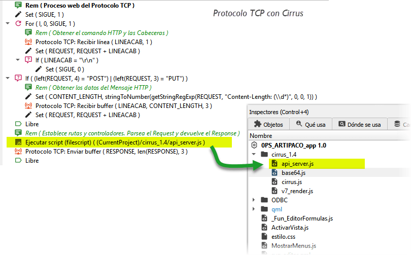 De este objeto nos interesa el subobjeto SERVER y el proceso asociado en el que, mediante los comandos de Protocolo TCP, programaremos el parseo de los mensajes HTTP que continen las partes REQUEST y RESPONSE intercambiadas con el cliente externo.