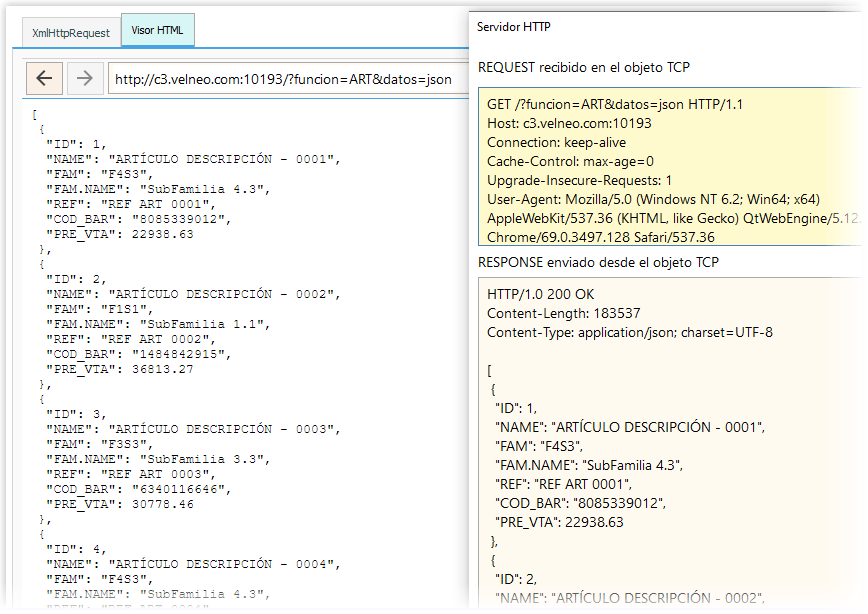 La imagen siguiente muestra el resultado de un mensaje HTTP con el comando GET. Se solicita la ejecución de la función remota ART con el formato de salida JSON. Como cliente HTML se ha usado el Visor HTML nativo de Velneo.