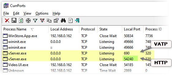 Si usamos un monitor de puertos veremos cómo el proceso vServer.exe está escuchando en 2 puertos. En la imagen siguiente vemos el puerto 690 para el protocolo VATP y el 54240 para el protocolo HTTP que usará el objeto protocolo TCP.