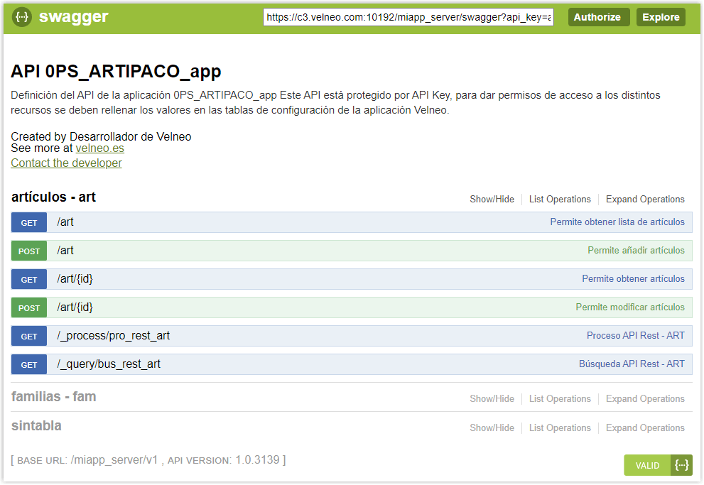 Para cumplir con el requisito de ser autodocumentado, el API Rest de Velneo ha desarrollado un proceso web con el nombre SWAGGER, con la misión de generar dinámicamente un fichero de definición del API disponible en la aplicación.
