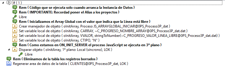 Antes de nada tenemos que Inicializar el array global PROGRESO_ARRAY y esto lo hacemos en el proceso ON_INIT_SERVER mediante el proceso JavaScript JS_ARRAYGLOBAL_INICIAR.