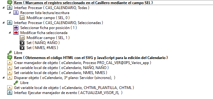 Primero actualizamos la tabla en disco con los datos pasados en el String JSON y después volvemos a generar el código svg de la tabla temporal SVG_CAL_MESES para el calendario seleccionado en el Casillero. El refresco secundario de Velneo mostrará el Calendario actualizado en el Casillero.