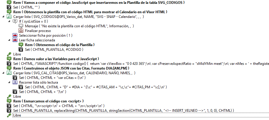 El proceso PRO_CAL_VER carga la plantilla con el código HTML e inserta en ella el objeto JSON con los datos de las Citas desde la tabla SVG_CAL_CITAS.