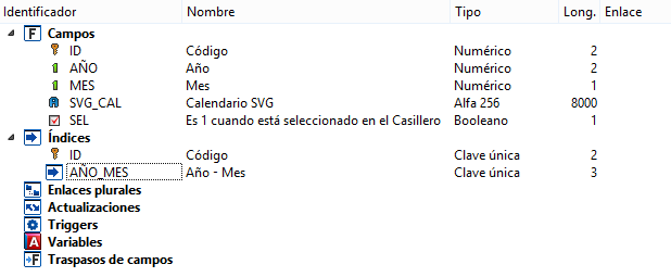 Los campos AÑO y MES determinan los meses y años que se van a mostrar en el Casillero. El índice AÑO_MES ordena el Casillero.