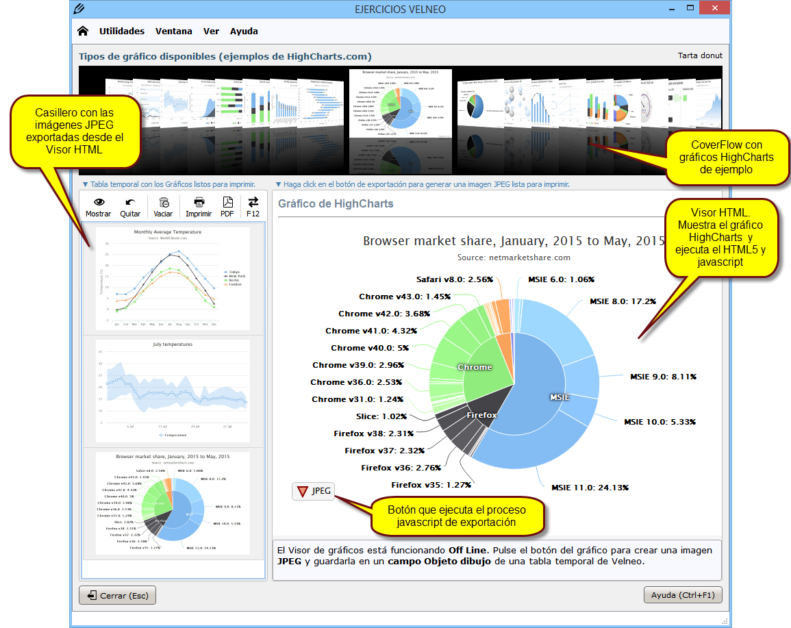 Para la construcción del ejercicio necesitamos exclusivamente un control Visor HTML con el código javascript necesario para mostrar el gráfico HighCharts y ejecutar el proceso de exportación de la imagen JPEG a Velneo.