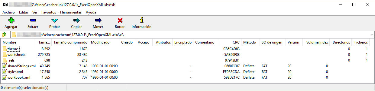 Dentro de la carpeta xl\ aparecen ficheros XML dedicados a definir la estructura del Libro Excel, de los Estilos y de los Textos compartidos. También están las carpetas que contienen las Hojas de cálculo y otros componentes relacionados.