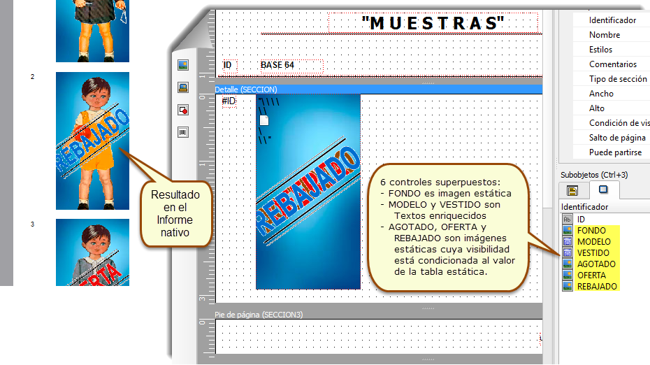 Para renderizar en un Informe nativo las imágenes superpuestas (modelo, vestido y sello) vamos a usar el control Texto enriquecido del Informe.