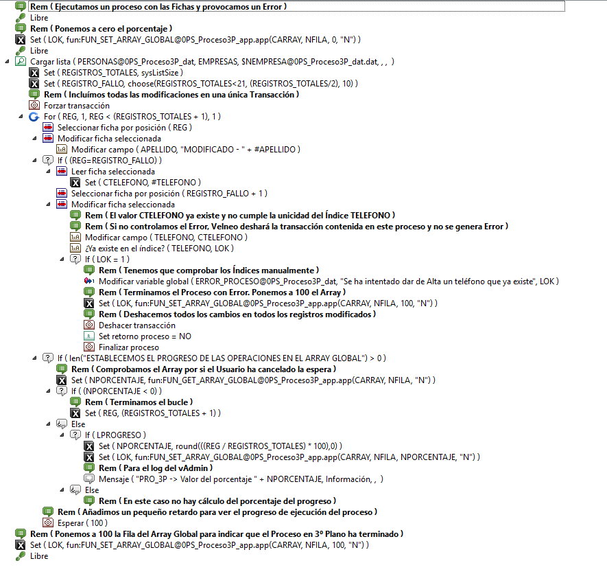 Uno de los procesos de este ejercicio provoca un error que desencadena la cancelación de la Transacción completa y guarda un mensaje de error en la variable global $ERROR_PROCESO.