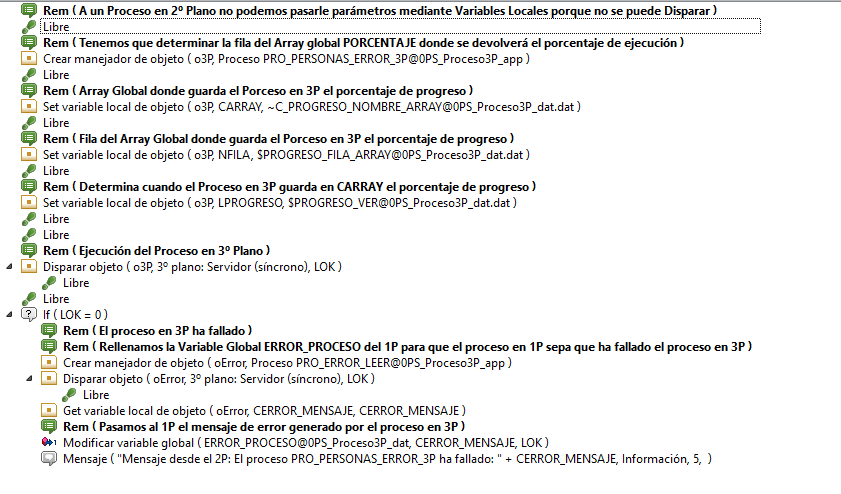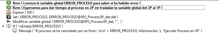 Para que el proceso en 2P sepa que el proceso en 3P se ha cancelado con error utilizamos el comando Set retorno proceso = NO.
