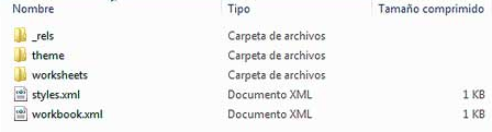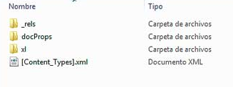 Como ya hemos dicho un archivo Office Open XML contiene principalmente datos basados en el lenguaje de marcado XML, comprimidos en un contenedor .zip específico. La estructura interna de un archivo xlsx se compone básicamente de 3 carpetas y un archivo.